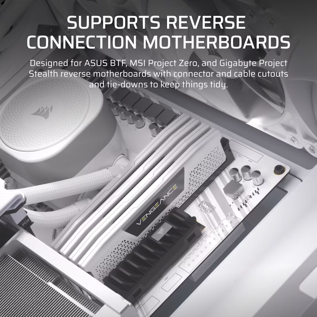 - High-Airflow White Mesh Front Panel – Optimized steel front panel delivers exceptional ventilation while complementing clean, modern build aesthetics.