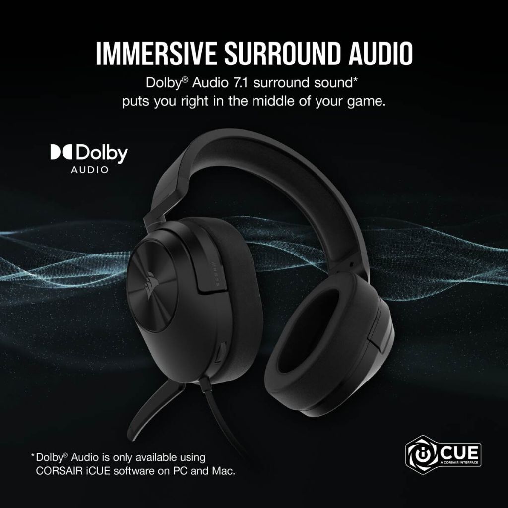 - The CORSAIR HS55 SURROUND Gaming Headset delivers essential all-day comfort and sound quality with memory foam leatherette ear pads and Dolby® Audio 7.1 surround sound on PC and Mac, without weighing you down thanks to lightweight construction. An omni-directional microphone picks up your voice loud and clear, and a 3.5mm audio connector ensures wide compatibility with most devices.