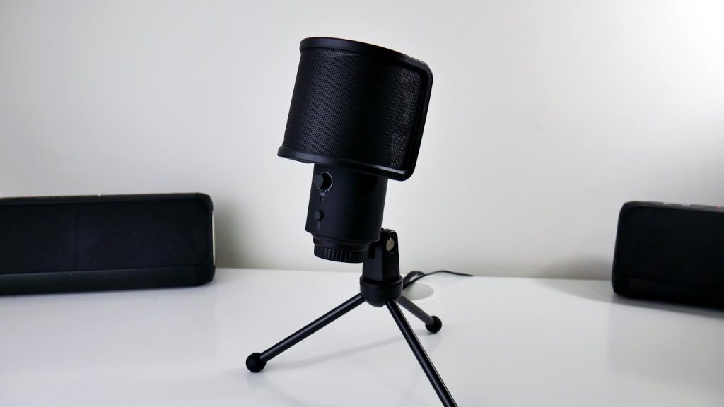 Type C USB mic with a pop filter, a volume dial, a mute button & a monitoring jack for recording. It has a solidly-built metal body.