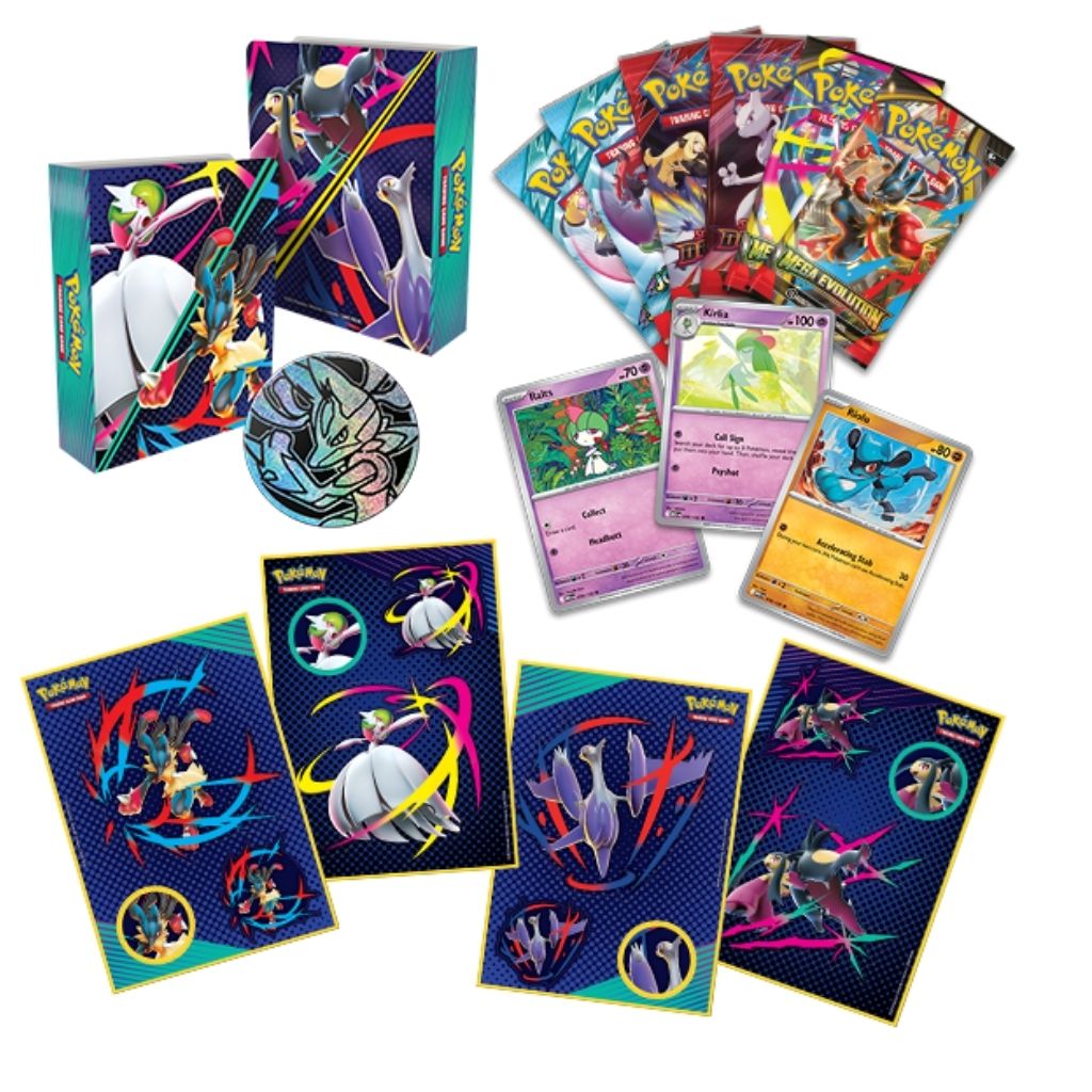 | Includes: | – 6x Pokémon TCG booster packs – (2 Journey Together, 2 Destined Rivals, 2 Mega Evolution) – 3x foil cards featuring Ralts, Kirlia, and Riolu – 1x Pokémon coin featuring Mega Lucario – 4x colorful sticker sheets – A mini portfolio to store your favourite cards |