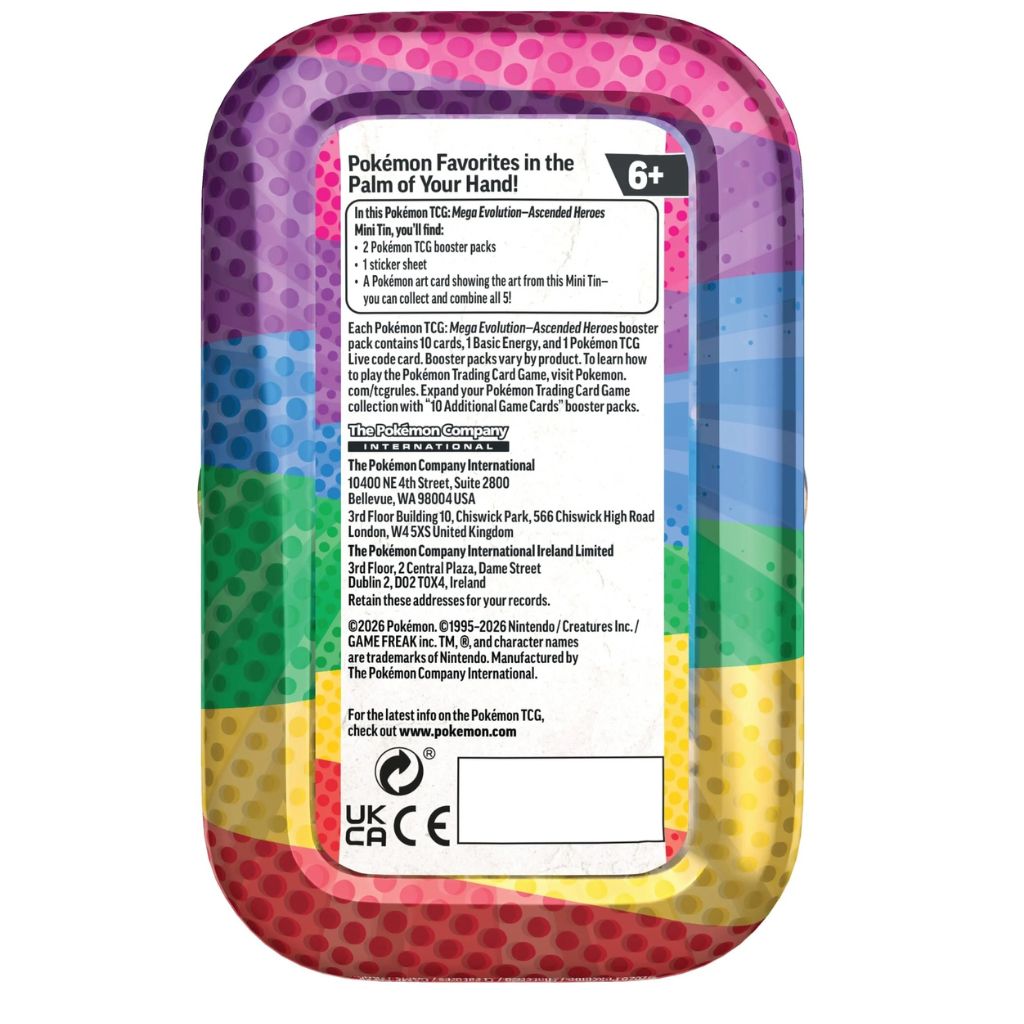 | Includes: | – 2x Pokémon TCG: Mega Evolution—Ascended Heroes booster packs (Per tin) – 1x sticker sheet (Per Tin – A Pokémon art card showing the art from this Mini Tin—you can collect and combine all 5! |