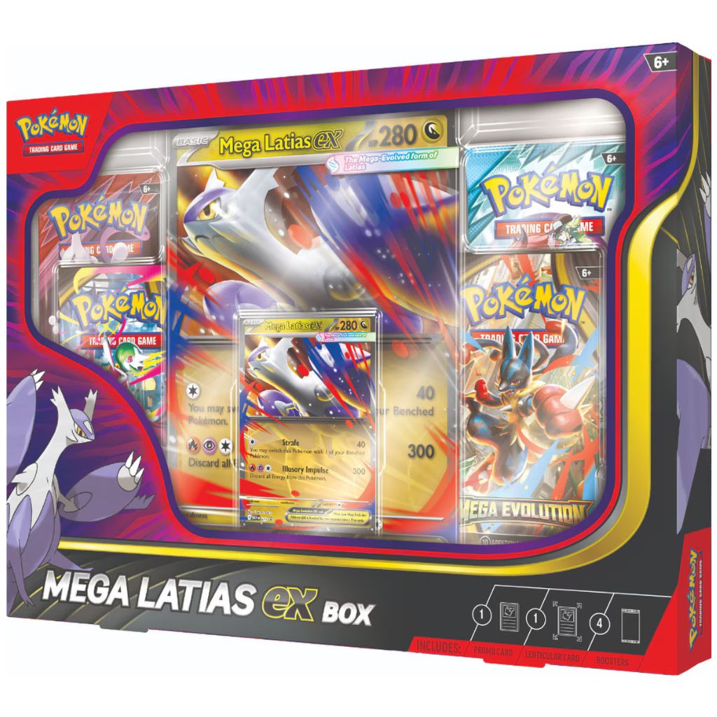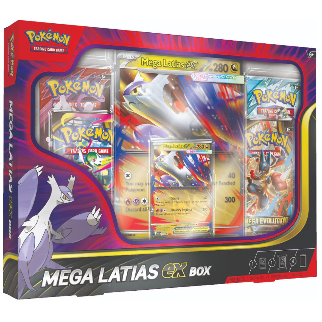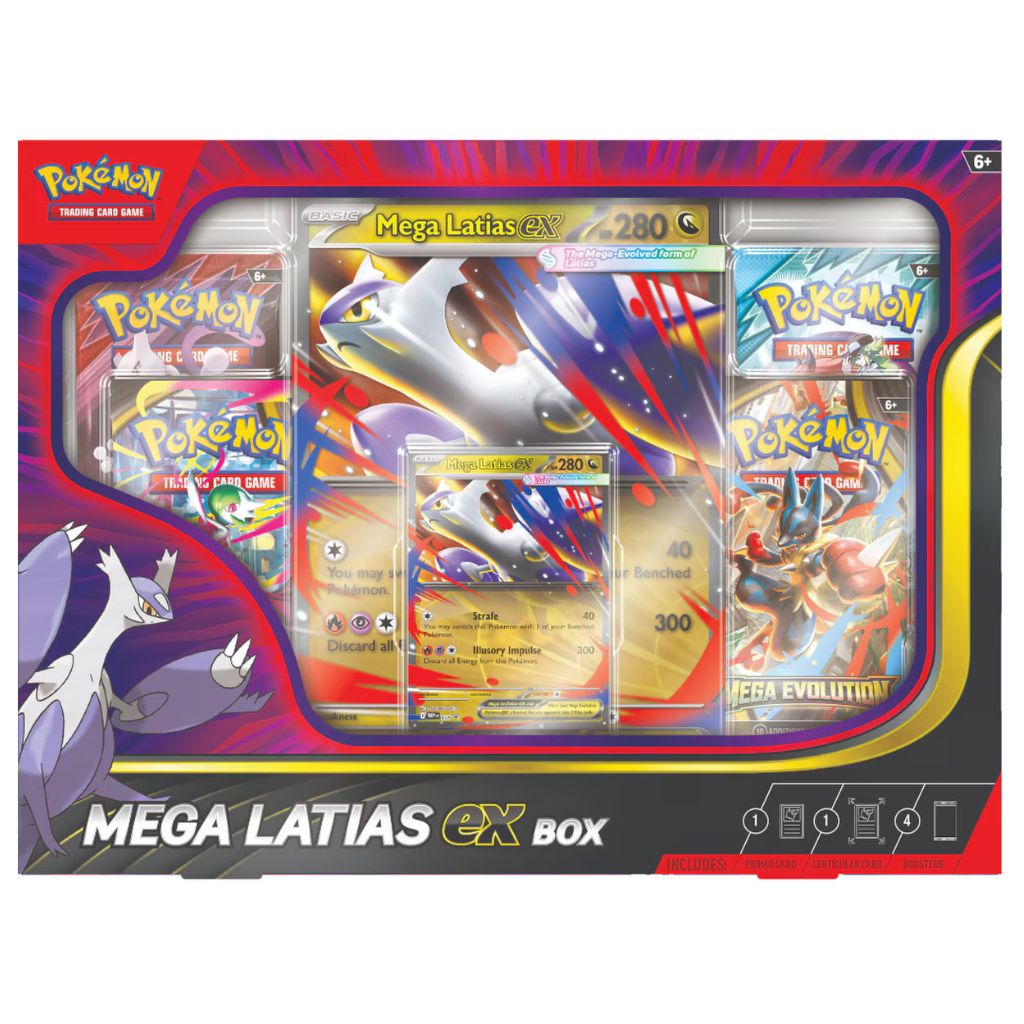| Includes: | – 1x Promo card featuring Mega Latias ex – 1x Oversized lenticular promo card featuring Mega Latias ex – 4x Pokémon TCG booster packs: 1x Journey Together, 1x Destined Rivals, 2x Mega Evolution |