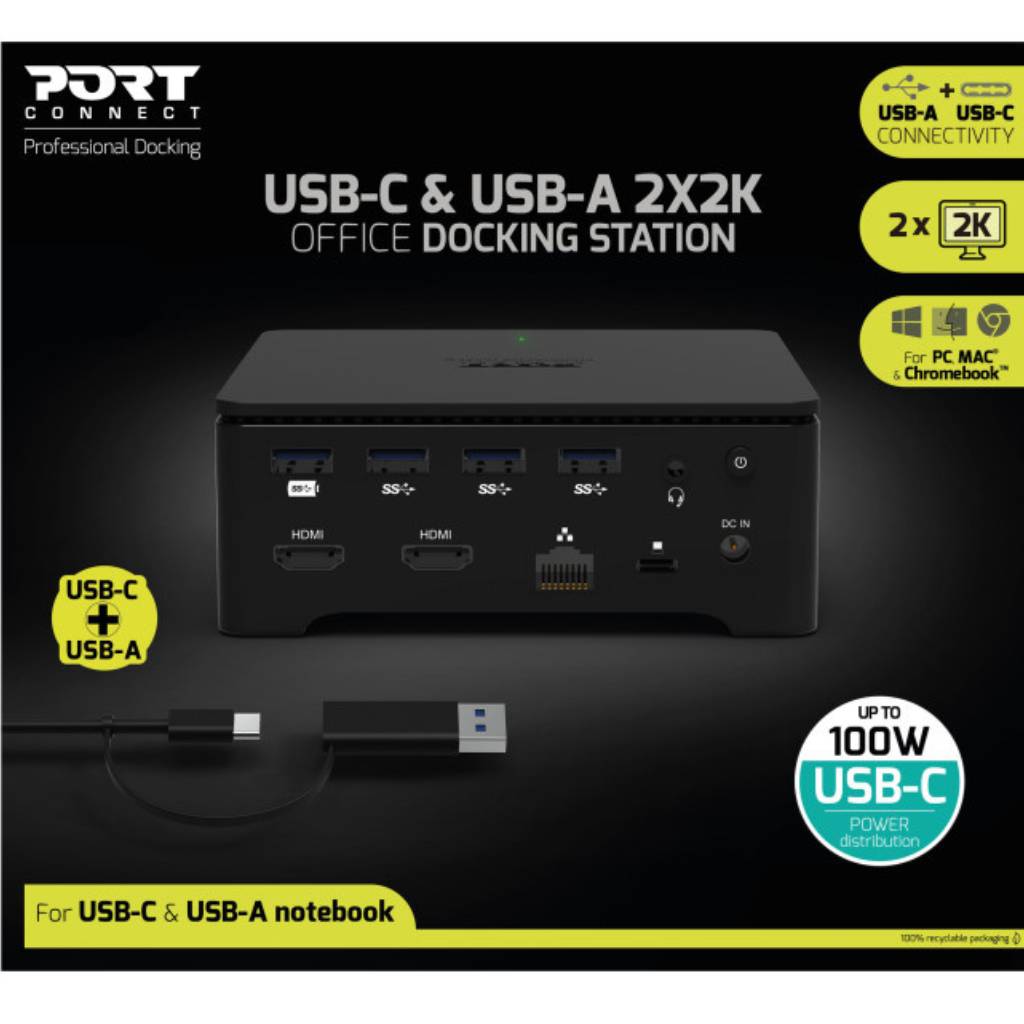 - The new Port Connect Type-C and USB Dual Video Docking Station with dual video output and increased laptop connectivity deliver up to 100W of power through a power replicator.